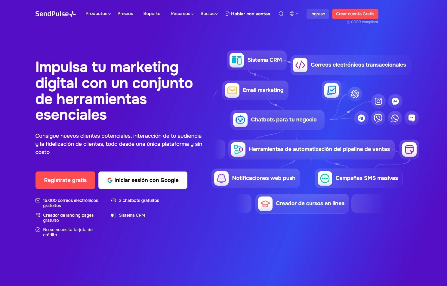 | SendPulse | Multicanal (email, SMS, chatbots), CRM integrado Planes personalizables | Curva de aprendizaje inicial Algunas funciones limitadas en plan gratuito | Gratuito hasta 500 suscriptores Standard: desde 9 $ / mes Pro: desde 10,80 $ / mes |