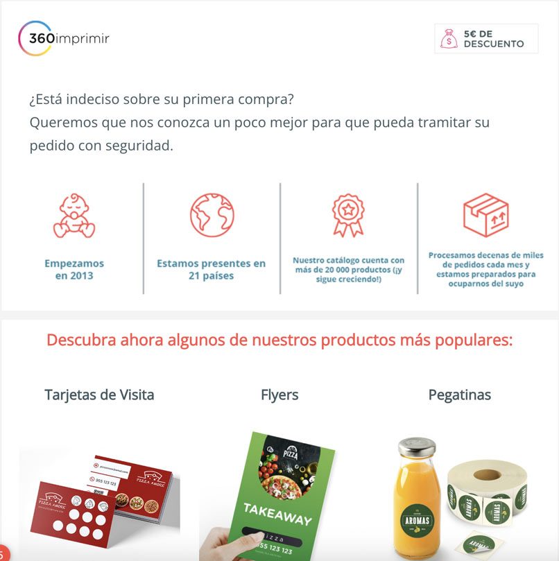 Aunque tu encabezado no es un lugar donde normalmente quieras poner mucho contenido informativo, puedes hacer una excepción para una oferta especial. Si estás teniendo una venta importante y quieres atraer inmediatamente la atención de los lectores hacia la venta, puedes incluir una referencia a esa venta en tu encabezado. Esto hace que la oferta sea más notoria y atrae a los lectores a mirar más de cerca y, con suerte, a realizar una compra. En este ejemplo de 360imprimir vemos en el header un descuento de 5€: