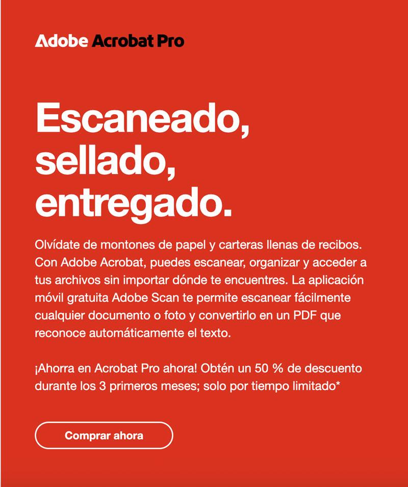 Otra forma sencilla y versátil de crear un gran encabezado de correo electrónico es usar color en la parte superior de tu mensaje. El encabezado no tiene por qué ser elegante. Simplemente usa tu color principal de marca y tu fuente de marca y ya estaría, como en este caso de Adobe: