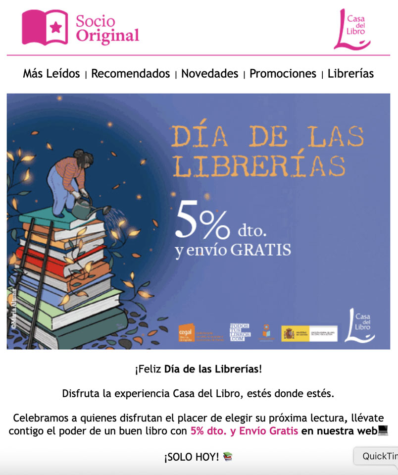 Si eliges personalizar tu encabezado, no está de más tener algunas versiones templatizadas para rotar entre correos electrónicos. Tener algunos estilos de encabezado de correo electrónico diferentes mantiene tus correos dinámicos e interesantes. Aquí te dejo un ejemplo de La Casa del Libro: