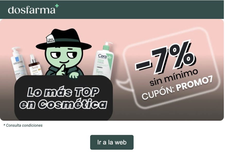 Una forma divertida de construir conciencia de marca y hacer que tu marca sea más cercana a la gente es usar una mascota de marca. Una mascota le da más personalidad a tu marca, e incorporar esa mascota en un encabezado de correo electrónico hará que el correo sea más cercano para los lectores desde el momento en que se abre. Así que si tienes una mascota íncluyela en tus envío, como hace dosfarma: