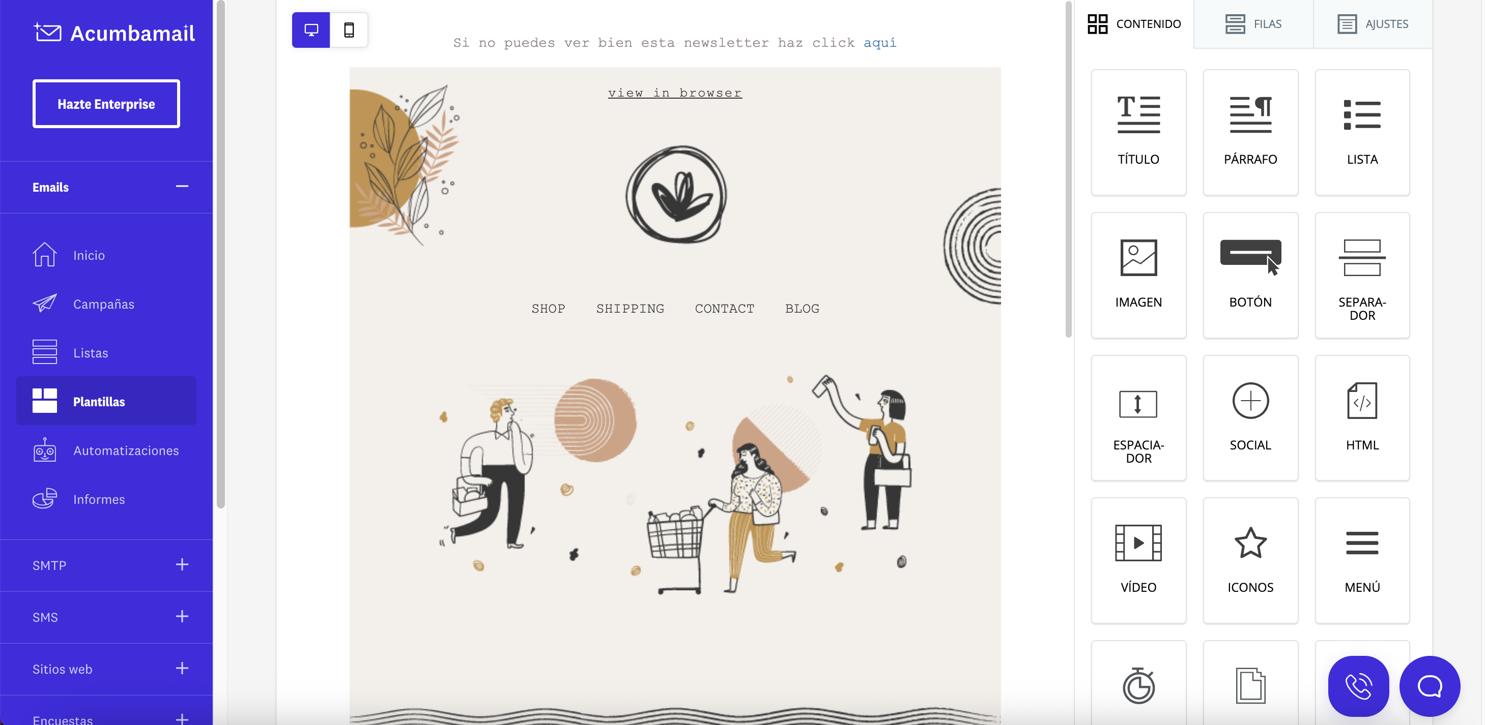La opción más versátil y fiable es crear tu encabezado usando HTML dentro de un correo electrónico HTML. Pero claro, para ello tienes que tener conocimientos mínimos de HTML o código, por eso, si no los tienes la mejor opción es usar un editor de correo electrónico HTML como el nuestro, que proporciona una interfaz fácil de usar que te permite arrastrar y soltar diferentes elementos y personalizar el correo electrónico como desees.