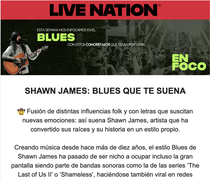 La animación en el encabezado es atractiva y capta la atención. Hace que el lector se detenga y se fije, y preste más atención al contenido del email. En este ejemplo de Live Nation se han animado algunos elementos del header:
