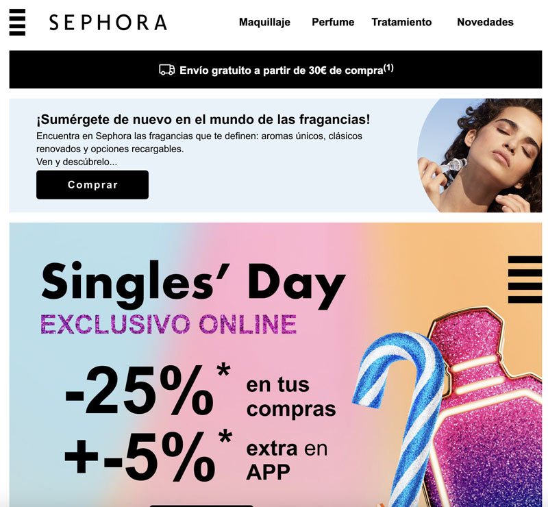Si tu negocio es un ecommerce puede ser muy provechoso que añadas un pequeño menú con tus categorías de productos principales que ridirijan direcatmente a tu web. Incluso puedes segmentar tu lista y hacer que los menús sean diferentes según la persona que los reciba o también condicionar esa parte del email para que haya diferentes variantes en función de tus receptores. Esta es una práctica que verás mucho en tu bandeja de entrada, como el caso de Sephora: