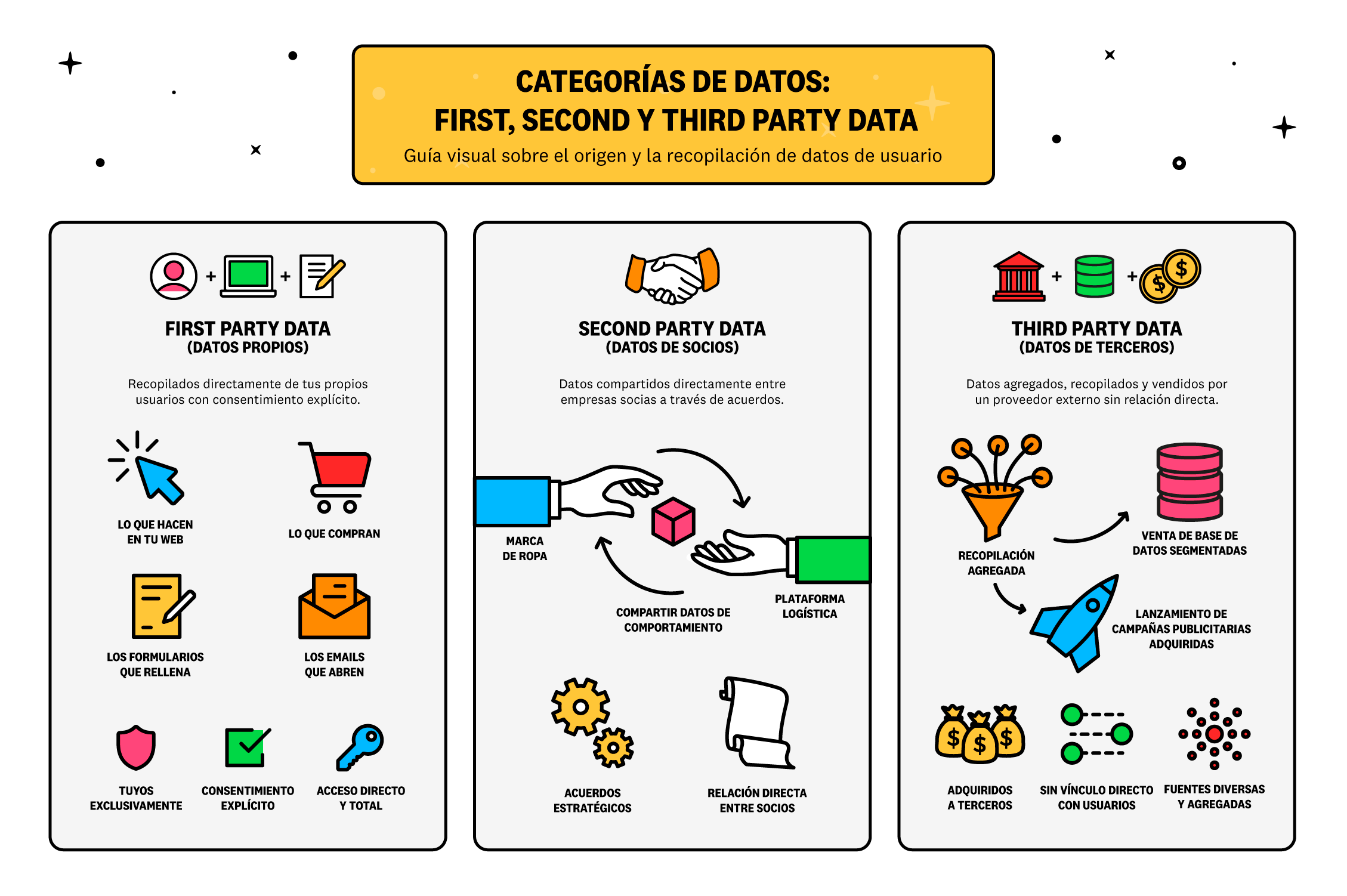 Una tienda online lo ilustra bien. Sabe qué productos ha visitado cada usuario en su web: eso es first-party data. Comparte información de pedidos con su socio de logística: second-party data. Y compra una lista de perfiles de potenciales compradores a un proveedor externo para hacer publicidad: third-party data.