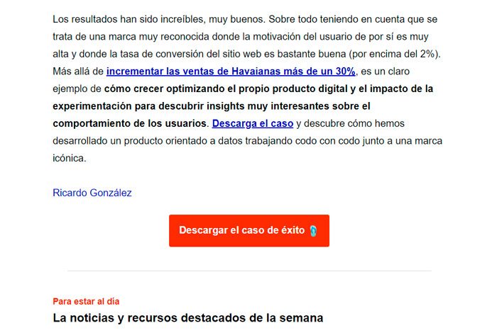 Hay marketers que prefieren utilizar un único enlace en texto para ello. No está mal si sólo hay un enlace en el email, pero lo más efectivo es colocar un botón con un color llamativo (naranja por ejemplo) o el color corporativo que uses y hayas establecido en tu guía de estilo para email.