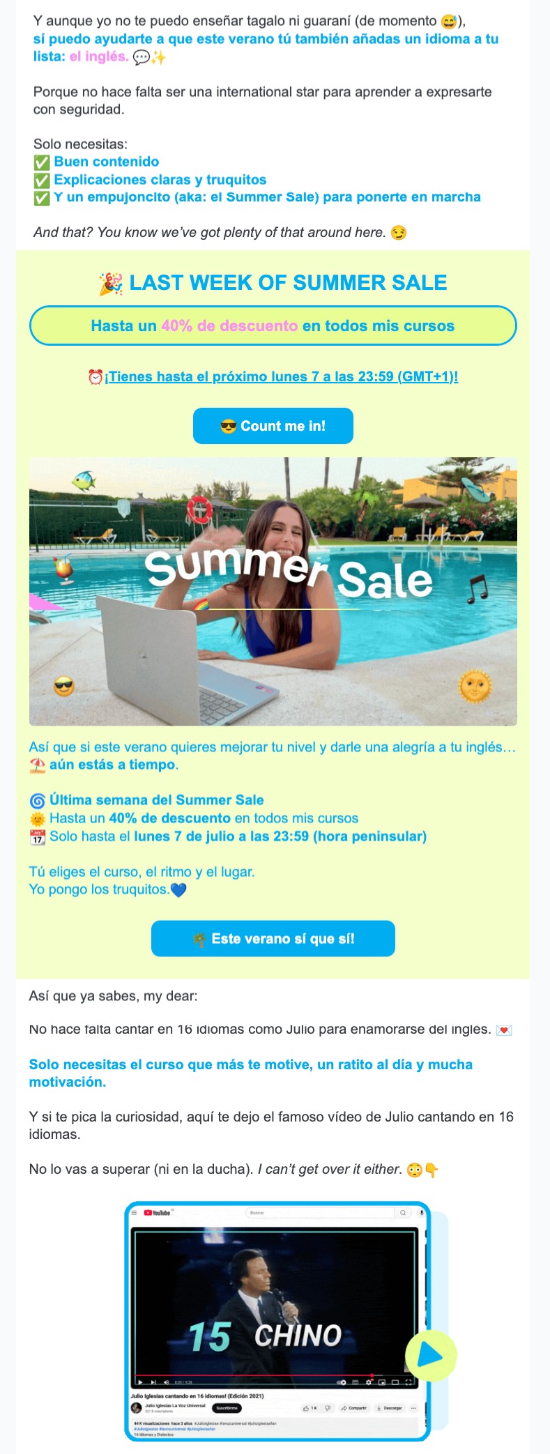 Aquí te dejo un ejemplo real de Maria Speaks English que cada verano lanza una oferta de verano para vender sus cursos de inglés.
