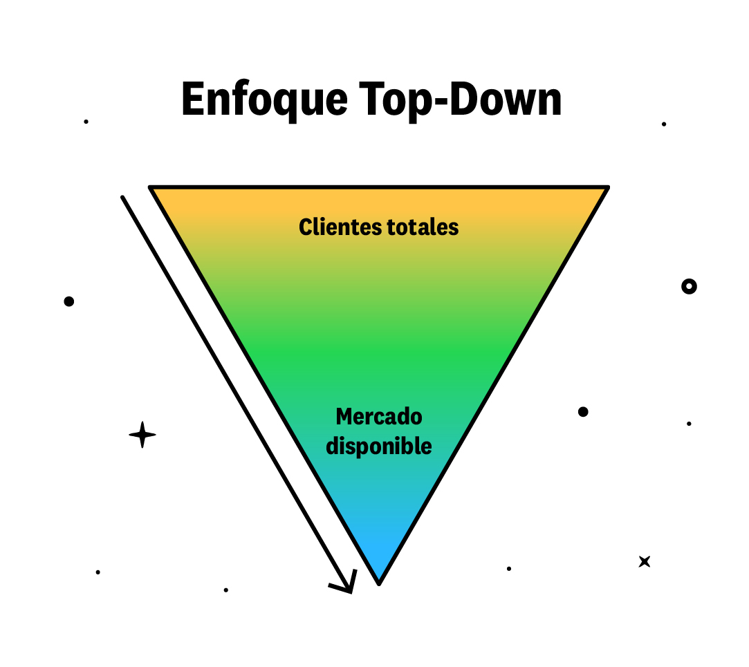 El método top-down parte de datos globales del mercado (informes sectoriales, estudios de analistas, estadísticas públicas) y los acota progresivamente hasta llegar al segmento objetivo.