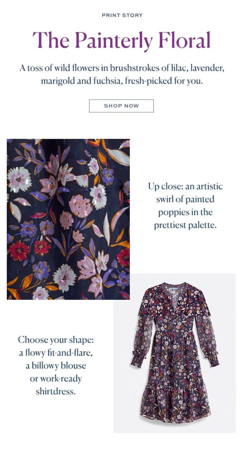 En este ejemplo, Draper James utiliza colores lilas, lavanda, amarillo y fucsia en el texto, combinándolos con el vestido que promociona. Así, el email mantiene una estética armoniosa.