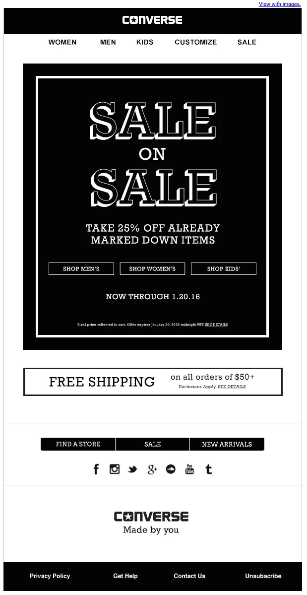 Sin color, tendrás que optimizar otros aspectos del diseño, como el uso del espacio en blanco, la tipografía y la jerarquía visual. Converse ha logrado un gran impacto con este enfoque minimalista en sus emails.