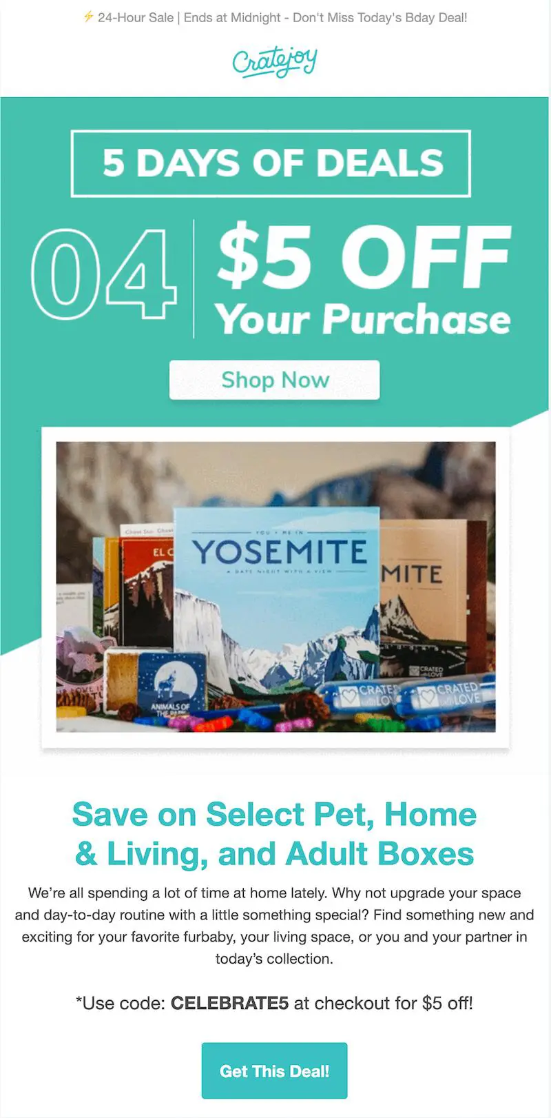 Lo ideal es elegir un color que encaje con la identidad visual de la marca y el diseño del email. Muchas marcas, como Cratejoy, usan el mismo color de su logotipo en sus botones CTA para reforzar su identidad visual y mejorar la conversión.