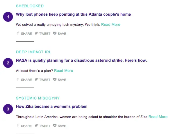 En este ejemplo Robinhood Snacks usa pequeñas pestañas de texto en verde para categorizar cada historia. “Tappy” y “Aww” destacan contenido imprescindible o adorable: