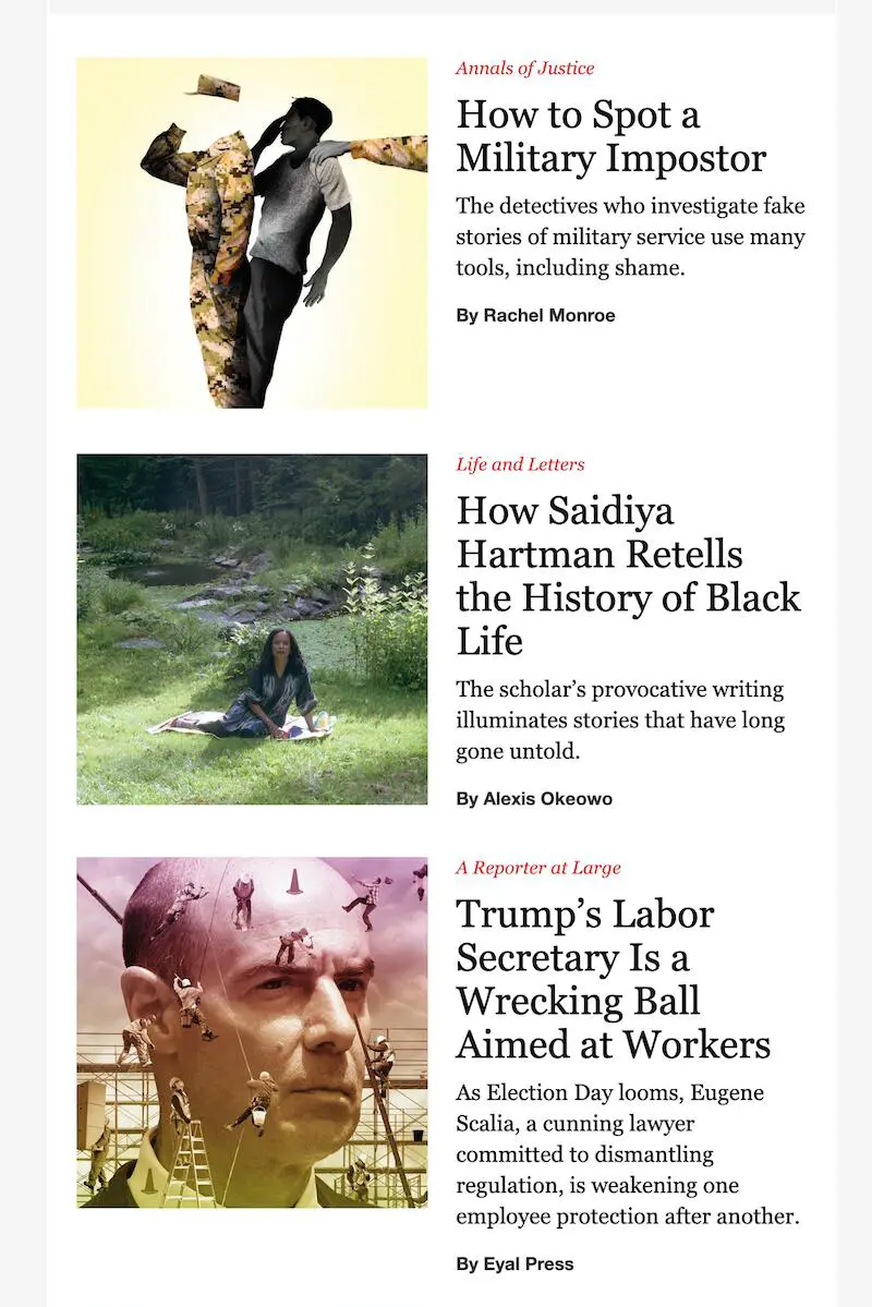 The New Yorker añade pequeños textos en rojo encima de cada titular para categorizar los artículos y captar la atención del lector.